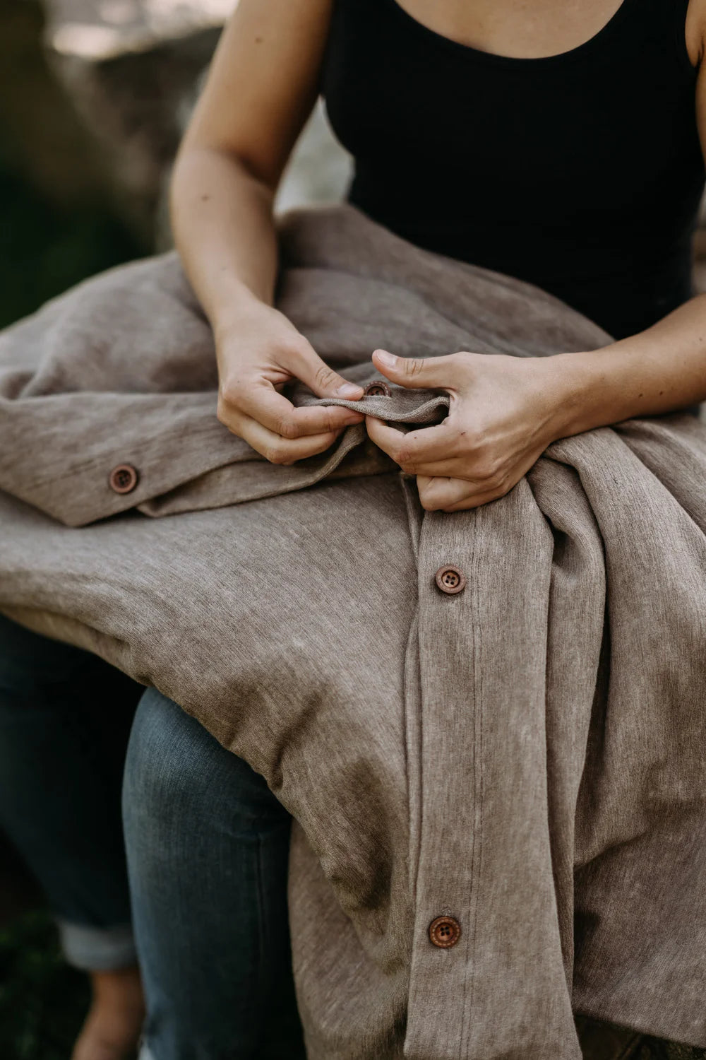 Tuplapussilakanassa on käsiaukot helpottamassa pukemista ja alareunassa puunapit, jotta sisäpeitto ei pääse liukumaan pois paikoiltaan.